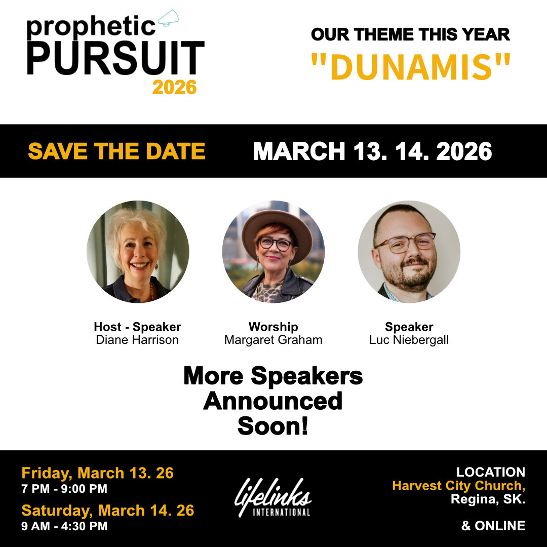 2026 Prophetic Pursuit + Add to Google Calendar + iCal / Outlook export 00 days 00 hours 00 minutes 00 seconds Date Mar 13 - 14 2026 Time All Day Location HARVEST CITY CHURCH 2202 8th Ave N, Regina, SK S4R 7T9 Website https://harvestcity.ca/ Organizer Lifelinks International Website http://lifelinks.org Share this event MOST RECENT POSTSNominations For 2025/26 AMP (Now Open) Download the 2023 LifeLinks Handbook Diane Harrison appointed as LifeLinks Prophetic Coordinator Ian Byrd Explains Vision & Values of LifeLinks
